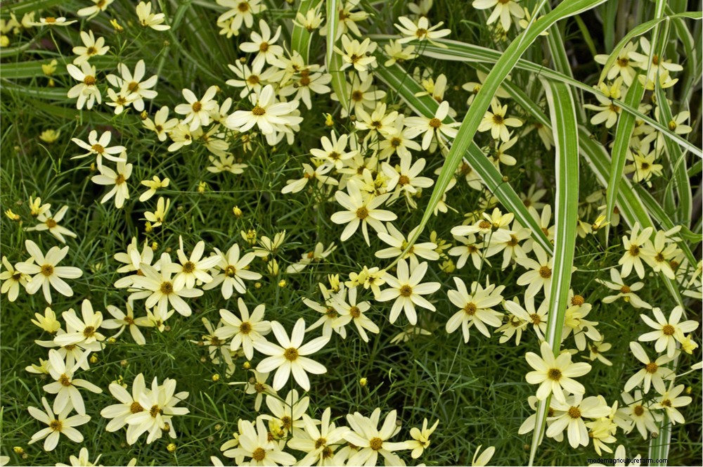 Also known as ‘Tickseed’ this plant produces pale yellow blooms with dark centres that stand out against their delicate foliage.