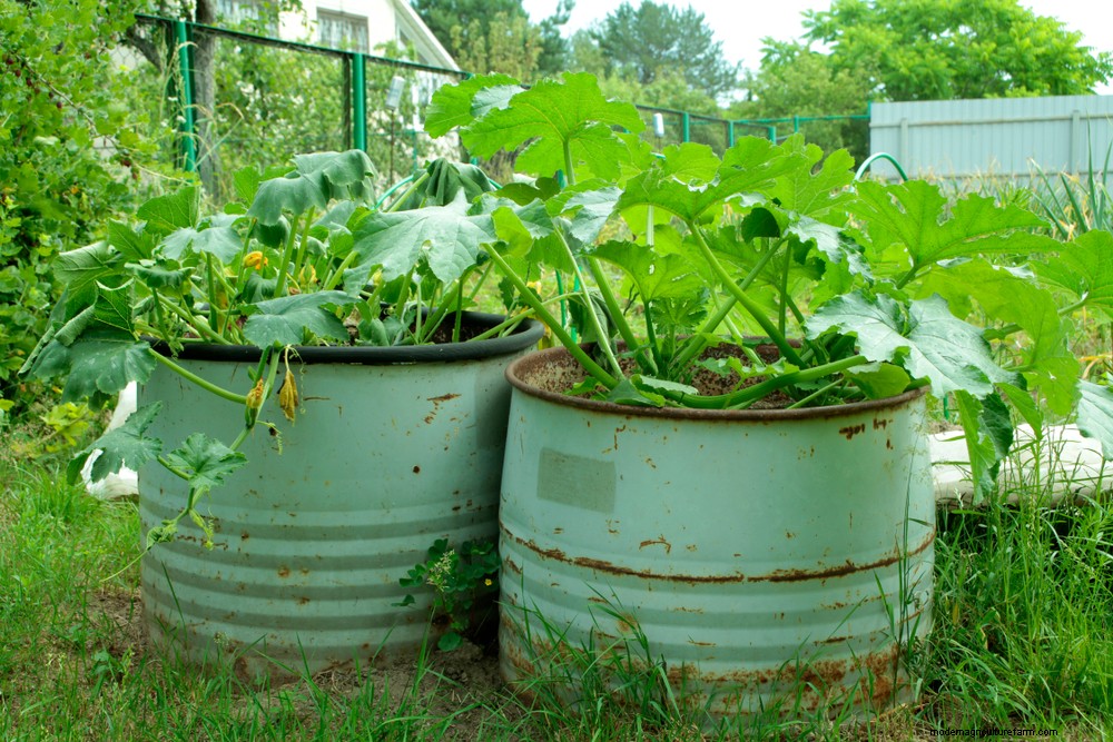 If you want to grow more than one zucchini plant, a half-barrel or other large reclaimed receptacle can be ideal. In half a 55 gallon barrel, you could place three-four zucchini plants, for example (perhaps even along with a few companion plants).