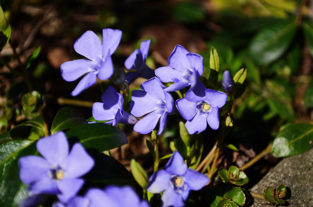 An easygoing groundcover that can handle lots of sun or lots of shade, periwinkle quickly spreads along the soil with its trailing stems adorned with evergreen, glossy, ovate leaves.