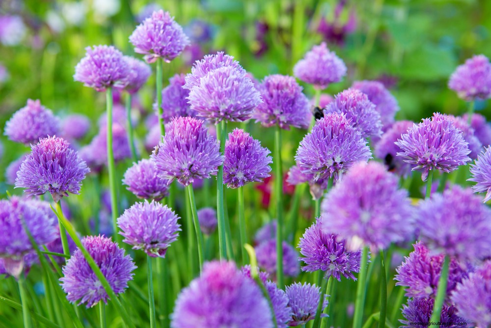 Chives bloom with pretty purple globe shaped flowers later in summer. Remove blooms as they appear to prevent the plant from going to seed, or allow a few to flower to encourage spread.