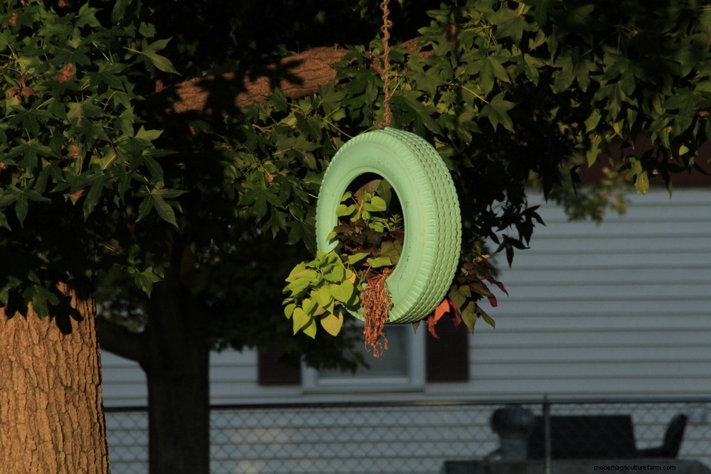 A hanging tire planter could be perfect for a balcony or porch, or even provide additional growing space in a greenhouse or sturdy, large polytunnel.