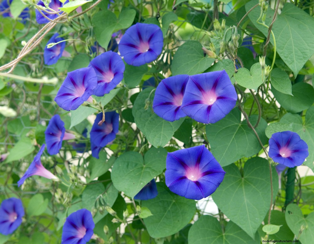 With heart shaped leaves on twining vines, morning glory blooms with trumpet shaped flowers in purple, pink, blue, red, or white, opening up in the morning sun.