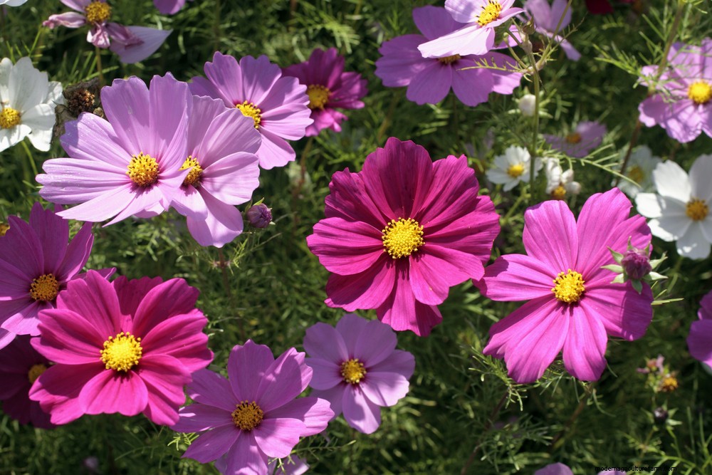Pink, purple, and white are the most common colors, but with dozens of cultivars, cosmos blooms may be seen streaked and rimmed with various hues.