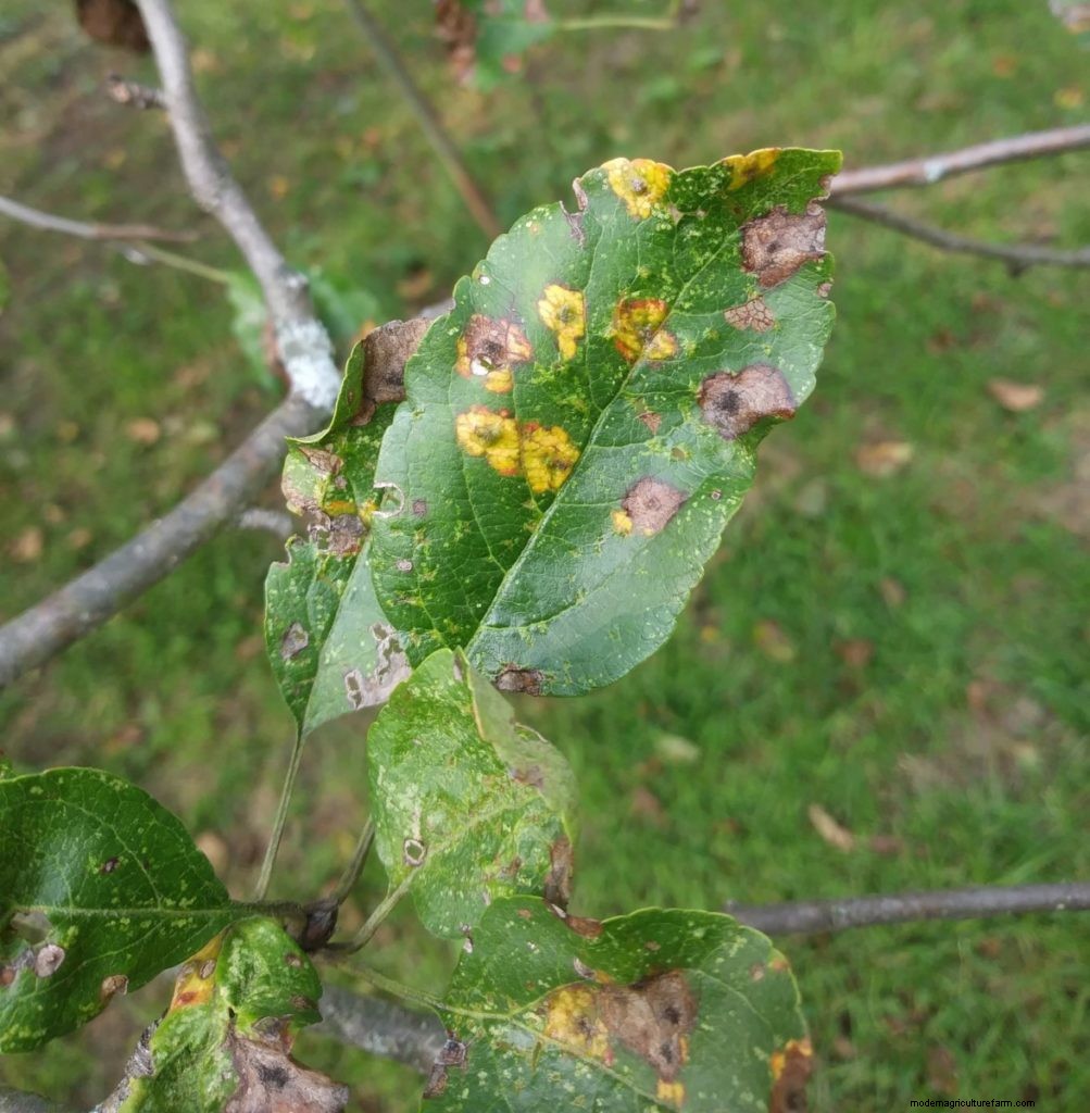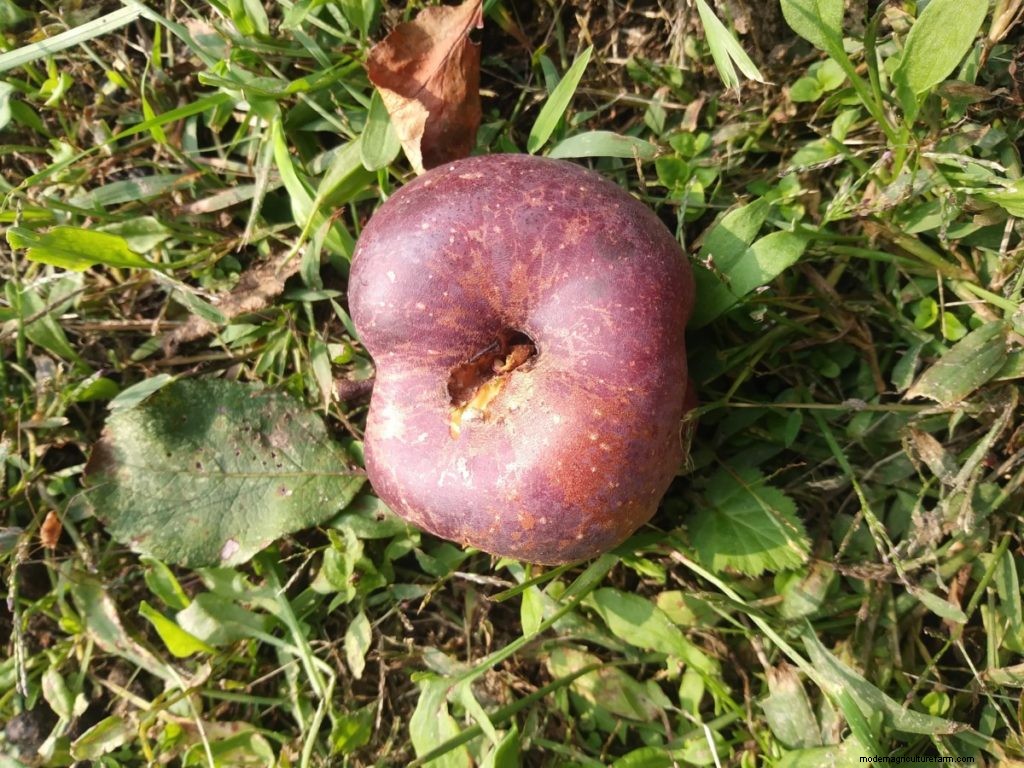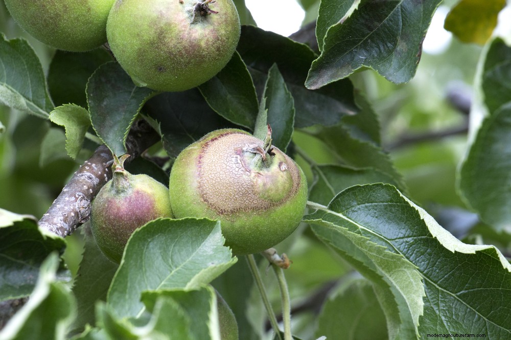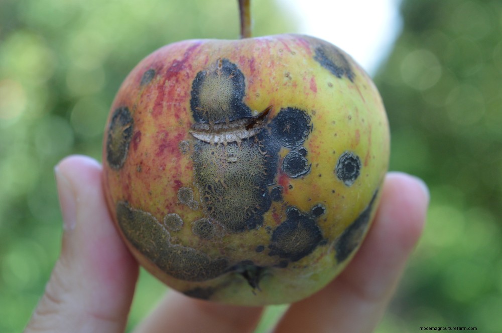 Apple scab is a fungal disease (venuria inaequalis) that can wreck your crop because it creates lesions for brown rot to enter the fruit.