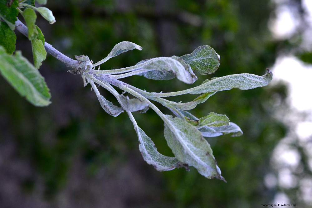 12. The apple leaves and branches are covered in a light white powder and are starting to shrivel.