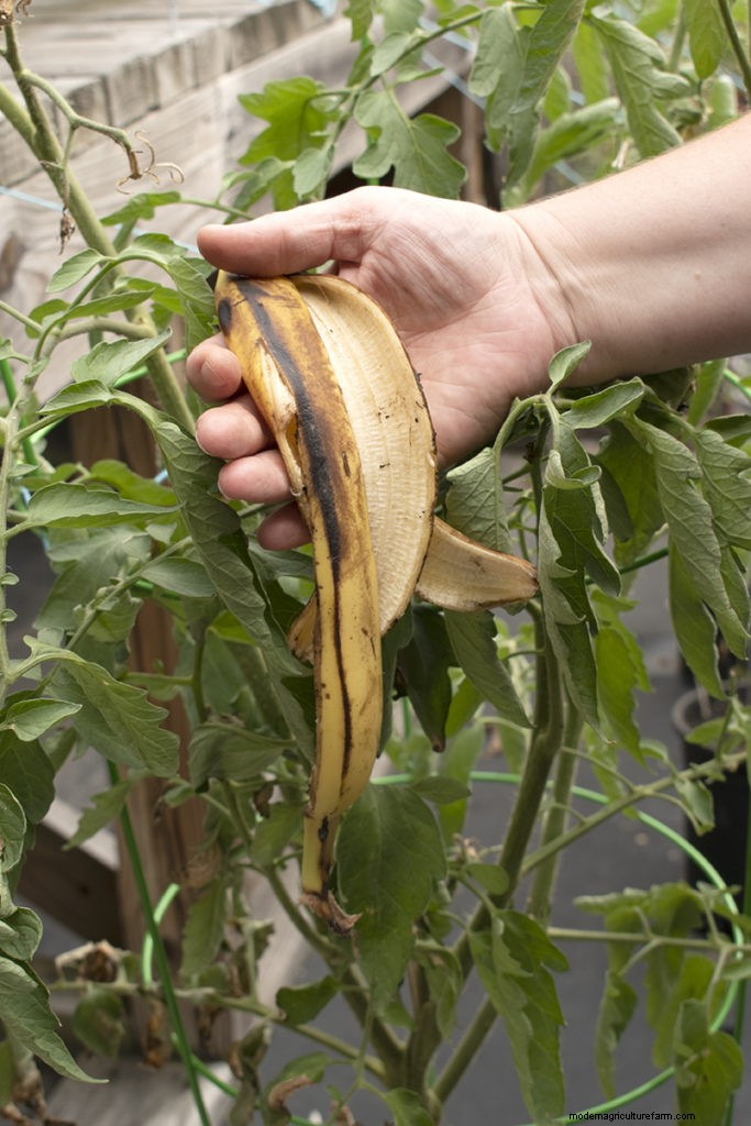 Start the season off right by popping a part of the banana peel directly into the bottom of each hole or container as you transplant your tomatoes and other potassium-loving plants. The peel will break down quickly, giving your plant the nutrients it needs to do well.