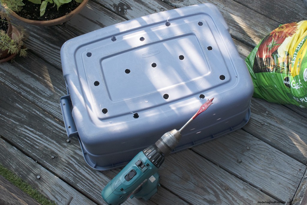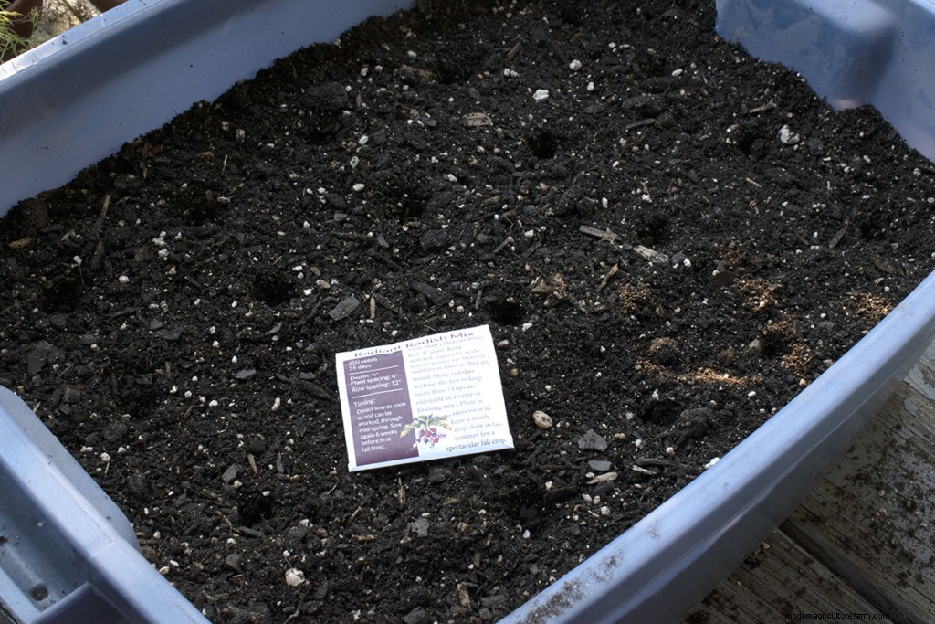 Drill several holes in the bottom of your container to provide good drainage. As radishes are a root crop, you don’t want them sitting in soggy soil. A good rule of thumb is to have about four holes per square foot across the bottom of the container, ½” in diameter.