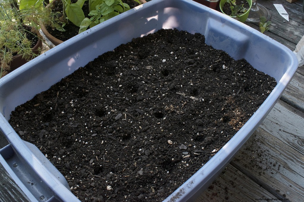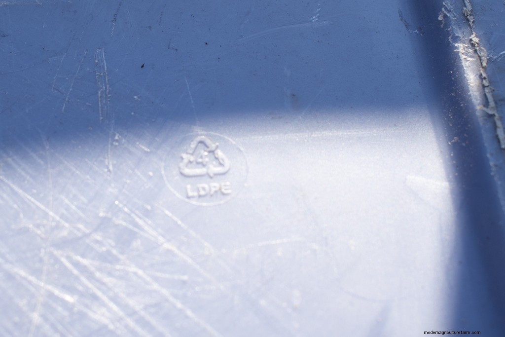 Shallow storage totes are the perfect radish container; you can even use window boxes. Just make sure the container you choose is around 6” tall. You’ll need to make sure it’s safe to grow food. Look for the recycling triangle on the bottom of your container. Numbers 1, 2, 4, and 5 are all safe to use for growing food.