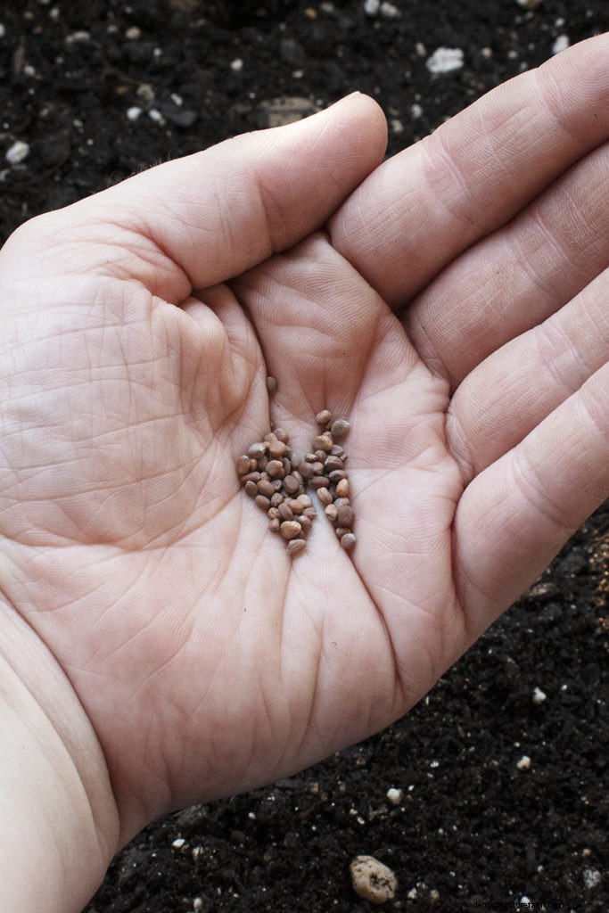 And when you water, make sure you’re using a light setting on your garden hose, like a soft shower. A watering can with a sprinkler head works great too. Or better yet, to conserve water and keep the soil moist and loose, use a small cup and bucket, and water directly at the base of the plant once it’s germinated.