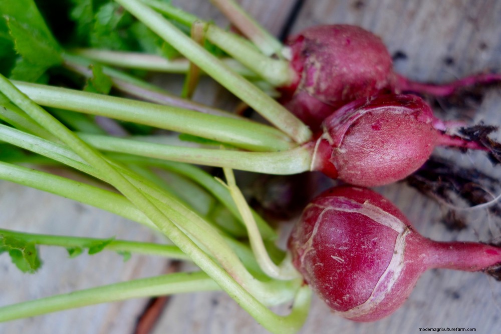 Radishes don’t like a lot of nitrogen. If there’s too much nitrogen in the soil, you’ll get the most beautiful radish tops with a spindly little pink root. And while radish leaves are edible (and quite tasty), I think we can agree the point is to grow the root, not the top.