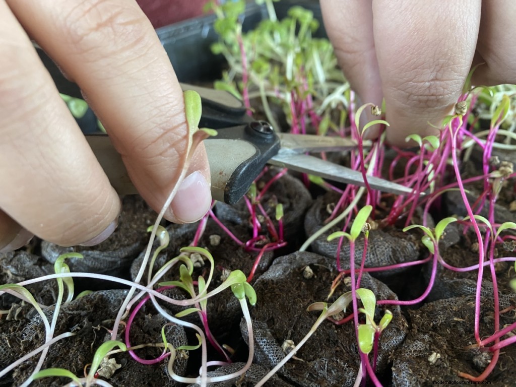 The best time to harvest your sprouting veggies is after their first set of leaves develop in 10 days to two weeks time after planting. Using pruning snips or floral scissors, trim the greens just above the soil level.