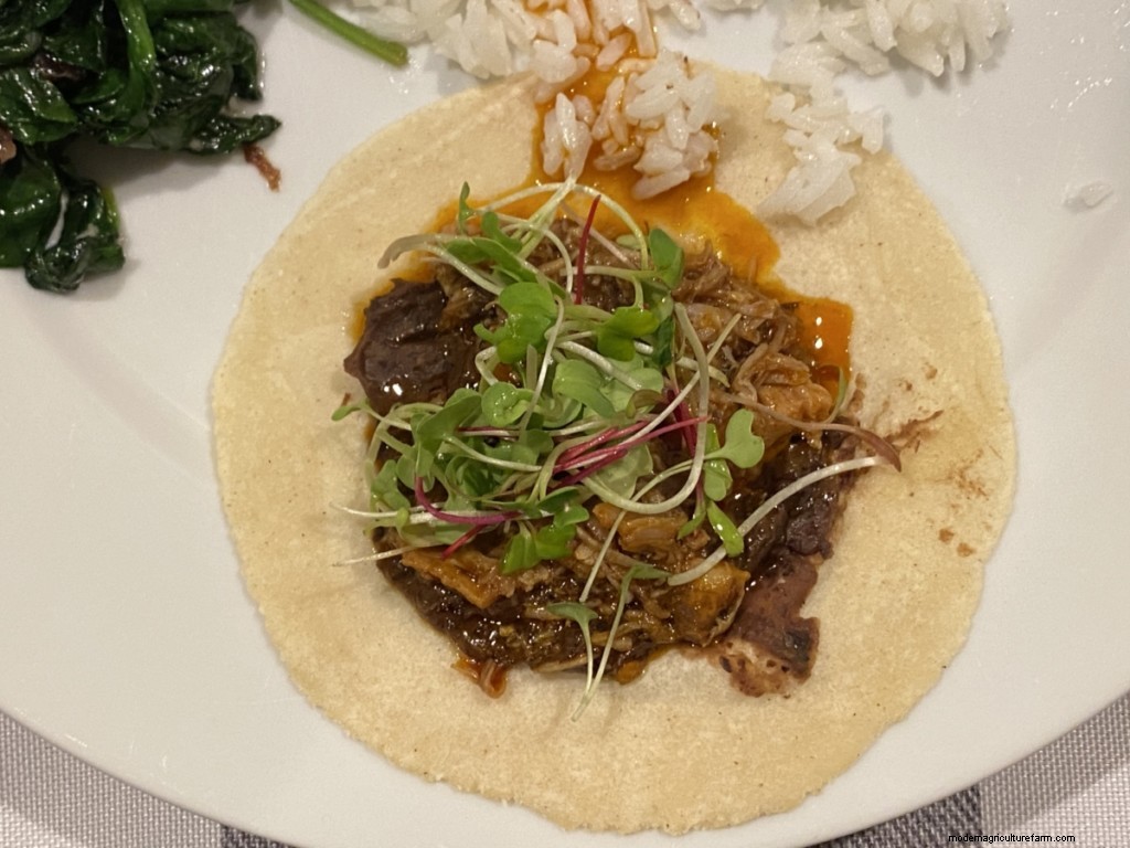For these tacos, homemade tortillas set the base, followed by sauteed mushrooms with pork in chile sauce. Top with fresh sprouted greens trimmed from your stash.