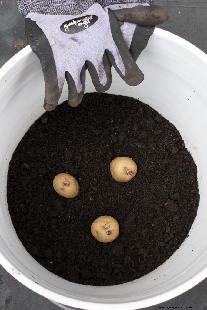 When growing potatoes in a bucket, don’t add growing medium right up to the top. Instead, fill your bucket around a third full, then place a seed potato (eyes or chits upwards) on top of this growing medium. Then cover it with around 3 inches more nutrient rich growing medium.