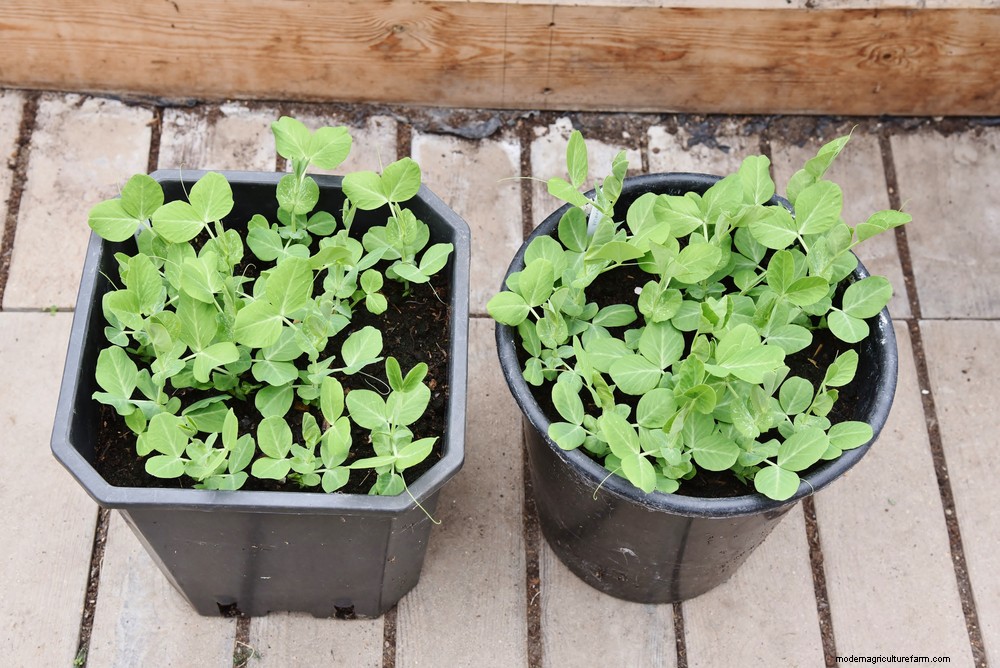 Tip: Once the peas are done, cut them off at the base rather than uprooting them. Then use the same container to grow plants that will appreciate the nitrogen. (Peas are a nitrogen fixing plant.)