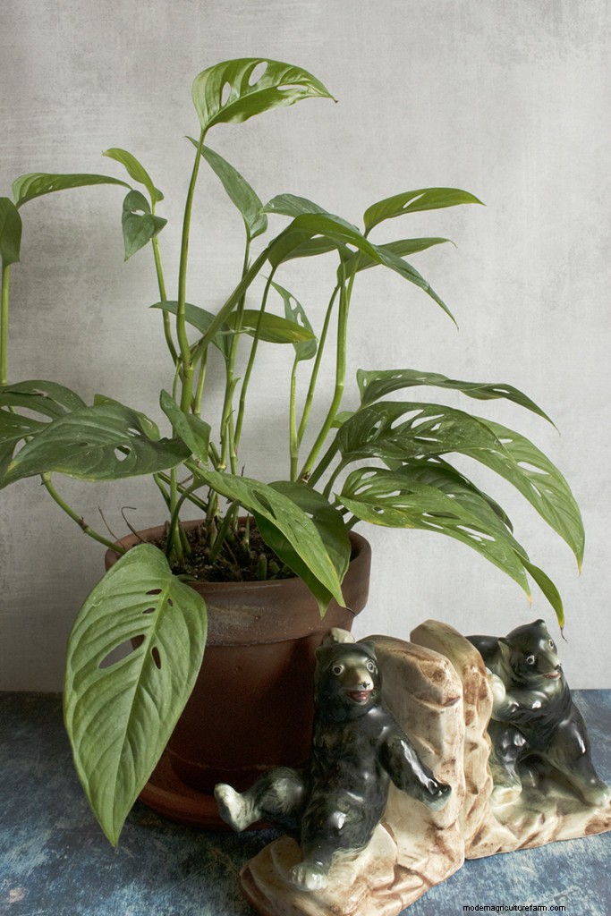 It’s also known as the swiss cheese plant, because of its naturally occurring holes, or slits, in the leaves. In its smaller, immature form, some of the leaves may not have any holes.