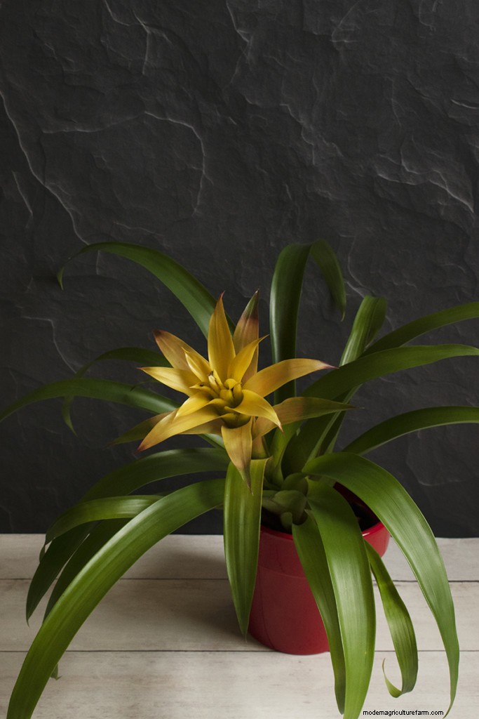 The Bromeliaceae guzmania is a popular choice with its large, showy flowers. Once finished blooming, they’ll produce pups that can be grown into new plants.