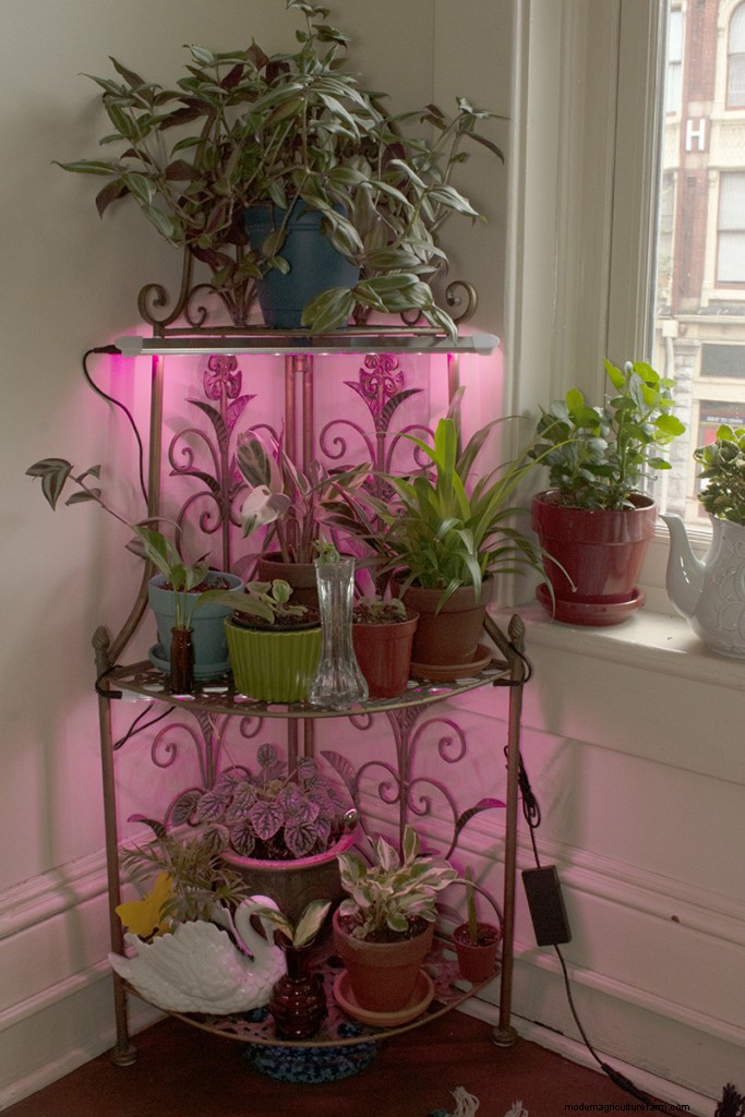 I have a lovely little corner plant stand that I rigged up with a couple of grow light strips.