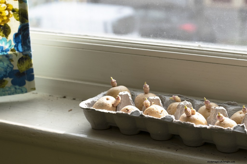 Put the potatoes in the egg carton, as if they were eggs, oblong-wise up, and place the carton somewhere cool and sunny. A windowsill works well. In a couple of weeks, you’ll have potatoes with sprouts that are around ¾” to 1” long.