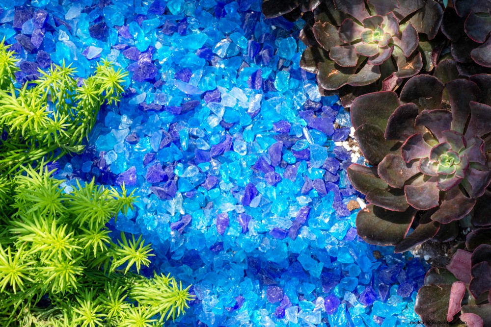 Another mulch material used for decorative effect is tumbled glass. Tumbled glass or sea glass in a range of hues can add colour and interest to containers, beds or borders. And while an organic mulch is better, decorative mulches will still help to protect the soil and keep water and nutrients where they need to be.