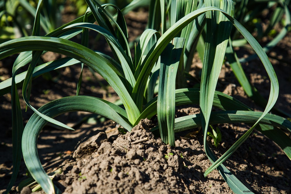 As the growing season progresses, the leeks will require additional soil mounded up at the base – as this is the process of blanching them or turning the leeks white. You can begin to blanch your leeks when the stems are about 1″ thick.