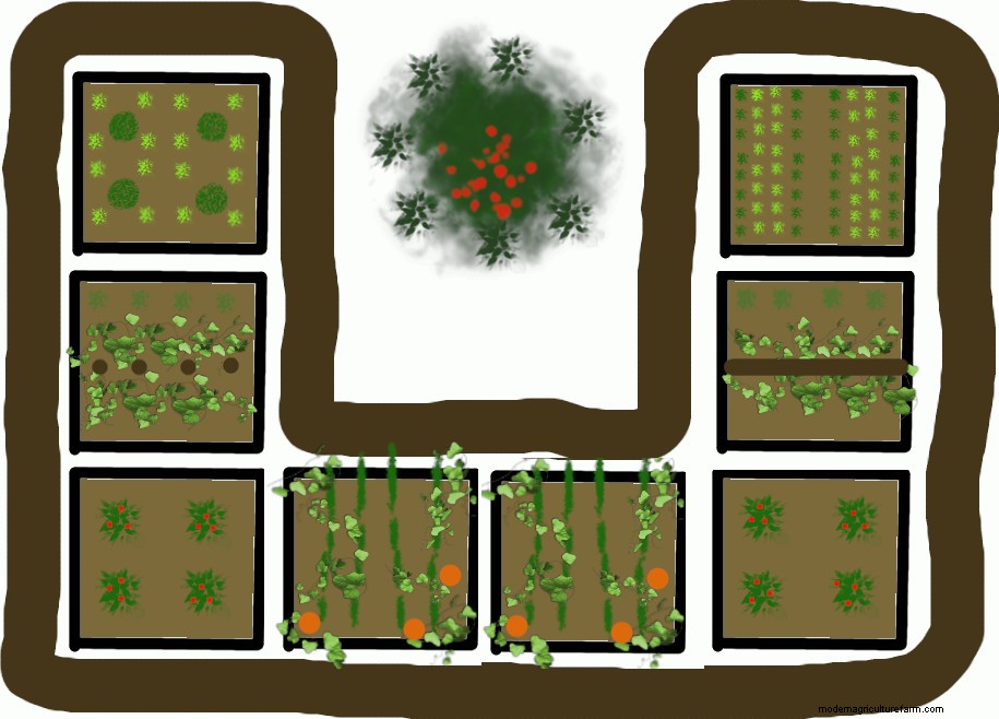 In this first layout, the idea is to adapt the most traditional approach. This is traditional row gardening, but also incorporates ideas relating to companion planting and intercropping.