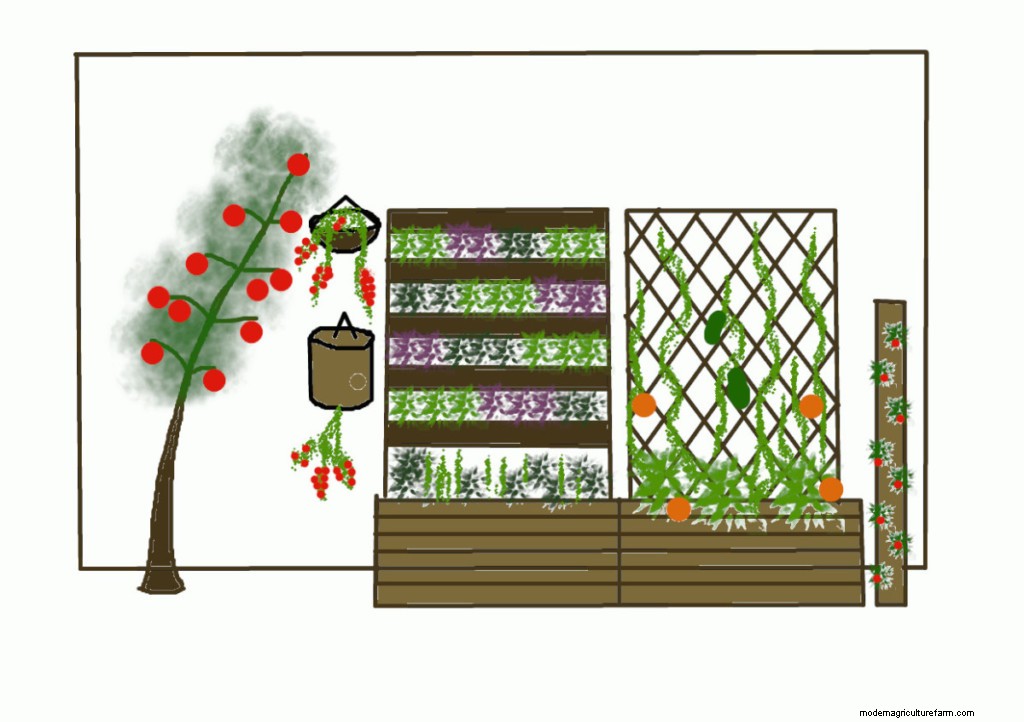 By using trellis, shelving, planters and hanging containers in a range of innovative ways, you could still grow plenty of food against a sunny wall or fence. The image above shows one potential layout idea for a vegetable garden of this type.