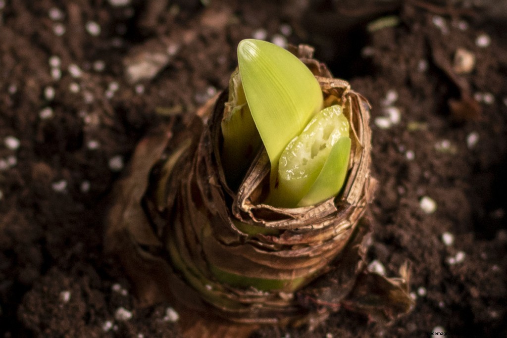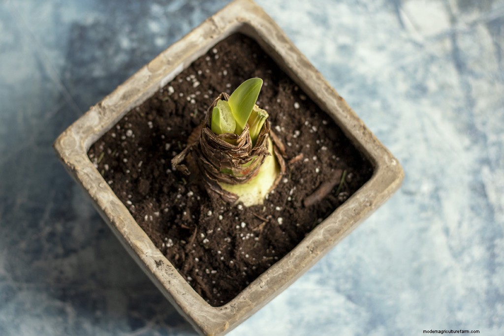 If your bulb was sitting in a dish of water or pebbles with no soil, it’s time to give it a more permanent home. Plant your bulb in a pot with a well-draining potting mix. Be sure the pot you choose has a drainage hole, as bulbs are notorious for rotting when left sitting in soggy soil.