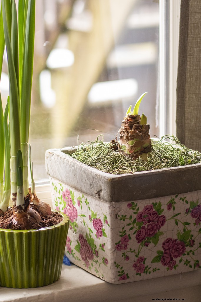 Keep your newly repotted bulb on a windowsill in a sunny location. It’s going to need that sun to store energy in its leaves so it will bloom again next year.