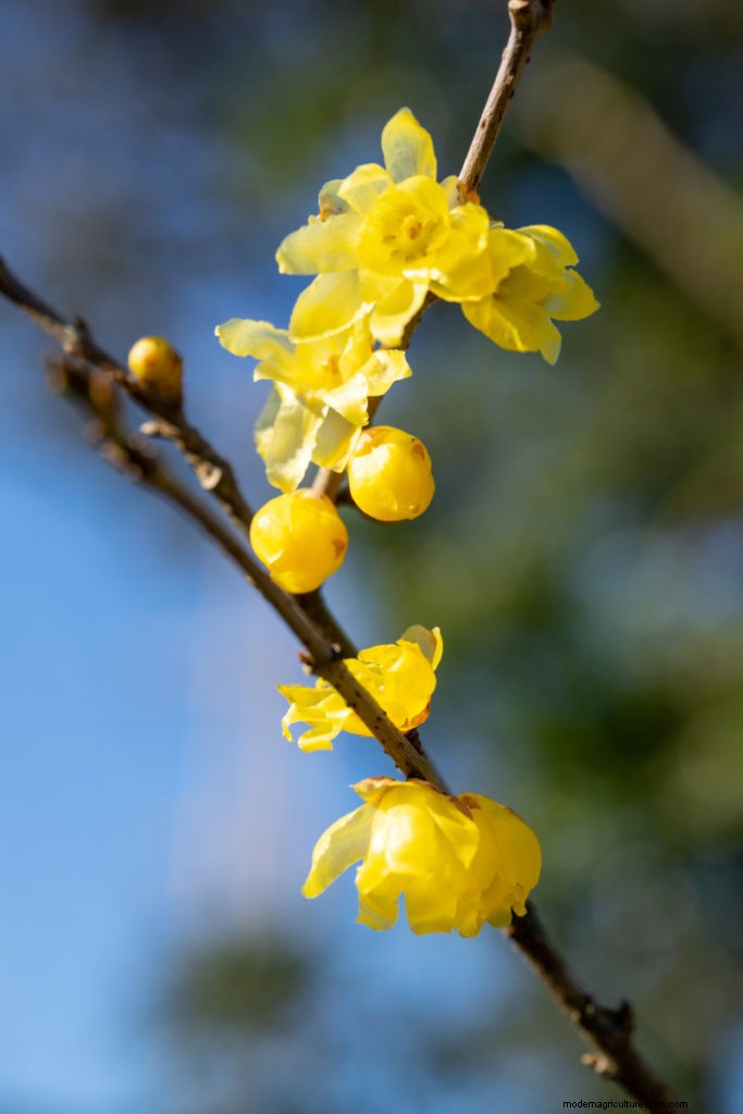 Wintersweet is another winter-blooming deciduous shrub that produces sweet smelling flowers on naked branches.