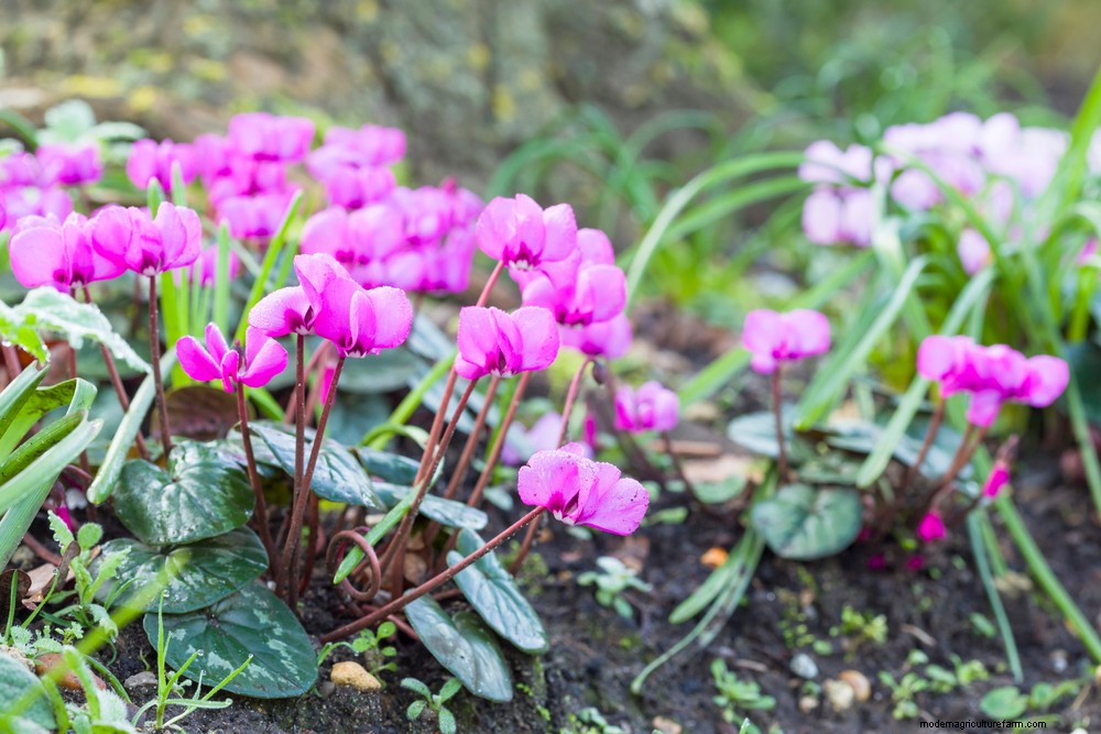 Its flowers emerge singly on stalks 6 inches high. The blooms have reflexed and winged petals in varying shades of white, light pink, magenta, and lavender.
