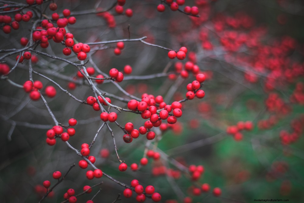 Although it blooms in spring with inconspicuous greenish-white flowers, these eventually give way to a massive crop of vibrant red berries in autumn. These persist on naked branches through winter, unless devoured by local birds.