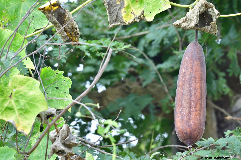 The fruit is edible and tastes like zucchini when picked young, but most people grow it to maturity so they can harvest the spongy insides.
