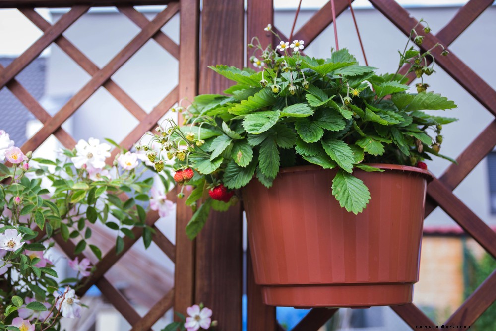 - Though compact and easy-going, strawberry plants do not appreciate crowded conditions. Two to three plants will be sufficient for a pot of 12–14 inches in diameter.