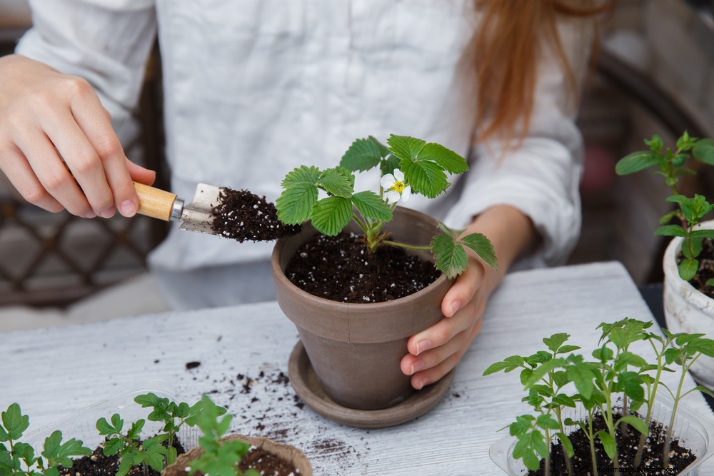 - Place strawberry plants in pots so their roots are covered and their leafy crowns are above soil.