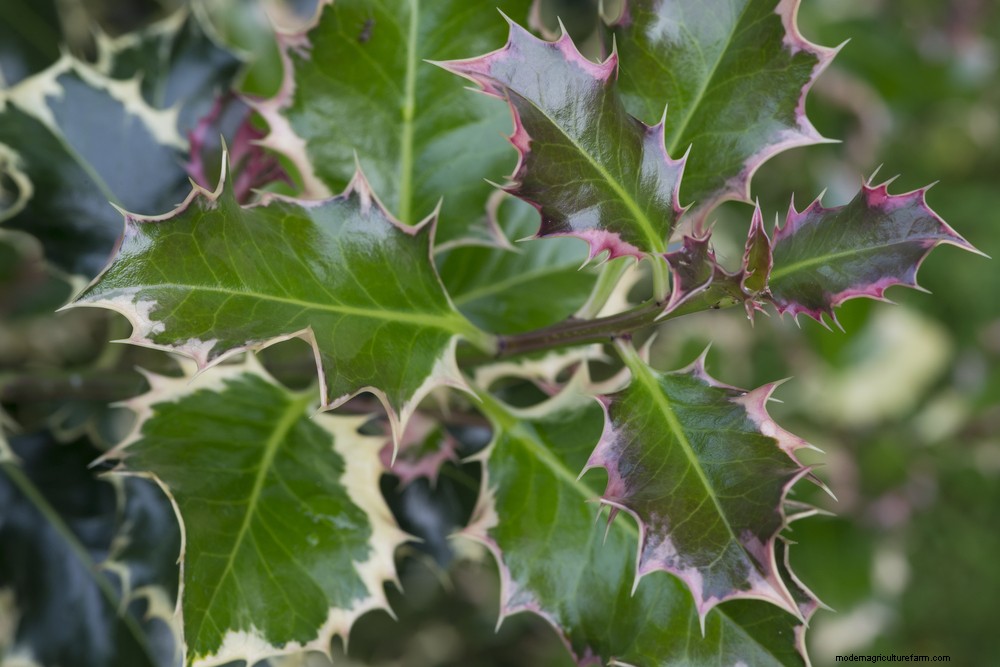 - ‘Silver Queen’: Attractively variegated evergreen leaves grow densely on dark purple stems. N.b. Male holly varieties do not bear berries.