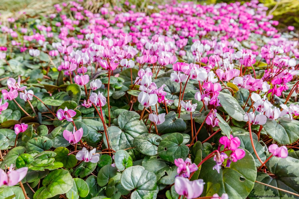 Cyclamen hederifolium and Cyclamen coum are excellent choices, creating joyous pink and magenta carpets with their wonderful large flowers and ivy-like, variegated leaves.