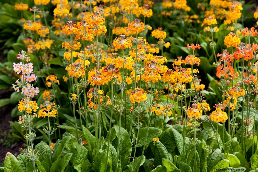 Candelabra primulas are best when they’ve seeded around to create a drift of multi-coloured flowers in fruity shades of pink, orange, coral and purple. They’re well-known as a moisture-loving waterside plant.