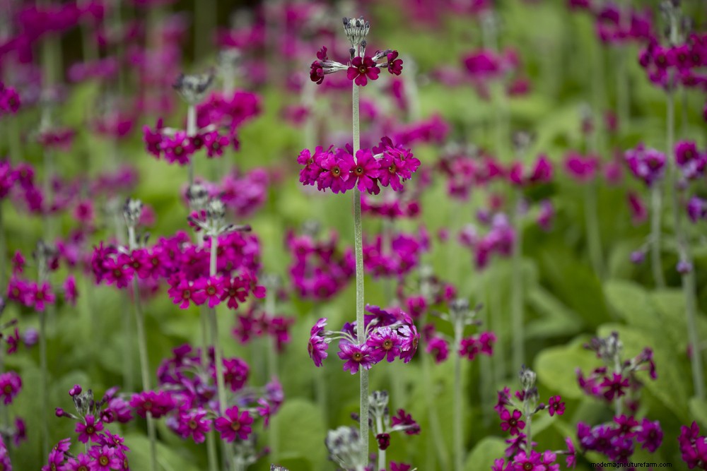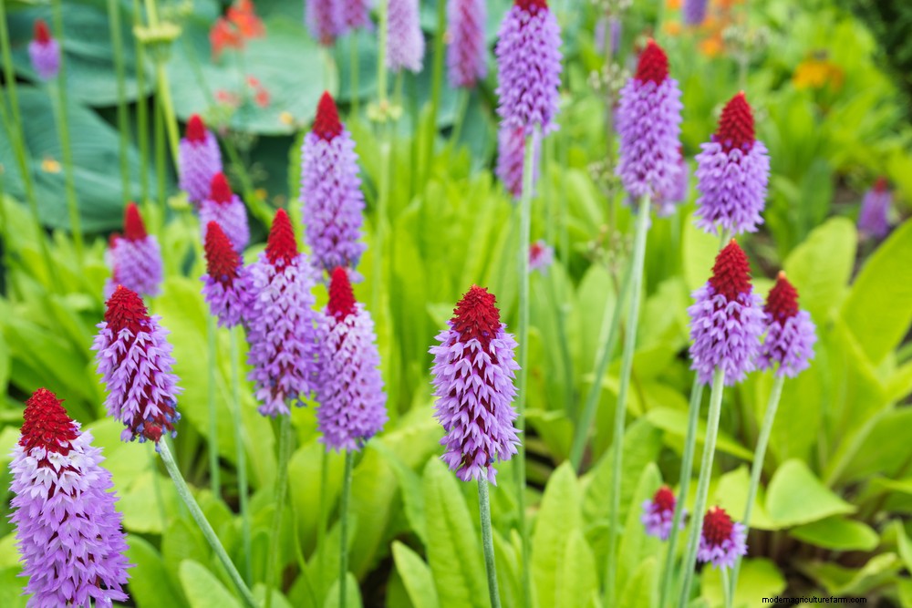 Primula pulverulenta looks outstanding when teamed with other pond-side plants such as the upright arrows of Iris pseudacorus or the unfurling emerald-green shuttlecock ferns of Matteucia struthiopteris. It flowers from late spring to early summer, when its stems shoot upward and open whorls of vivid blooms.