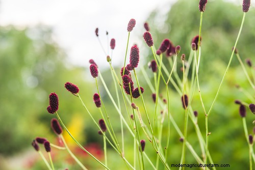 Great burnet (Sanguisorba officinalis) is a herbaceous perennial that produces swathes of wine-red flowerheads all summer and mingles well with damp-loving grasses such as Festuca and Molinia. It’s the perfect choice for adding a shot of intense colour to a ‘prairie style’ patch of planting in the garden.