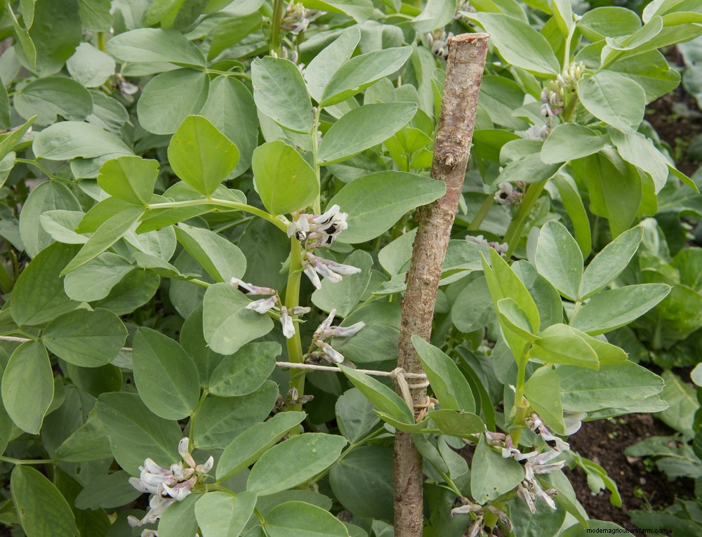 Once fully grown, the plants will need staking. The easiest way to stake broad beans is by driving steel fencing pins into each corner of your broad bean area. Next, simply tie a string or rope around to keep everything in the middle upright.