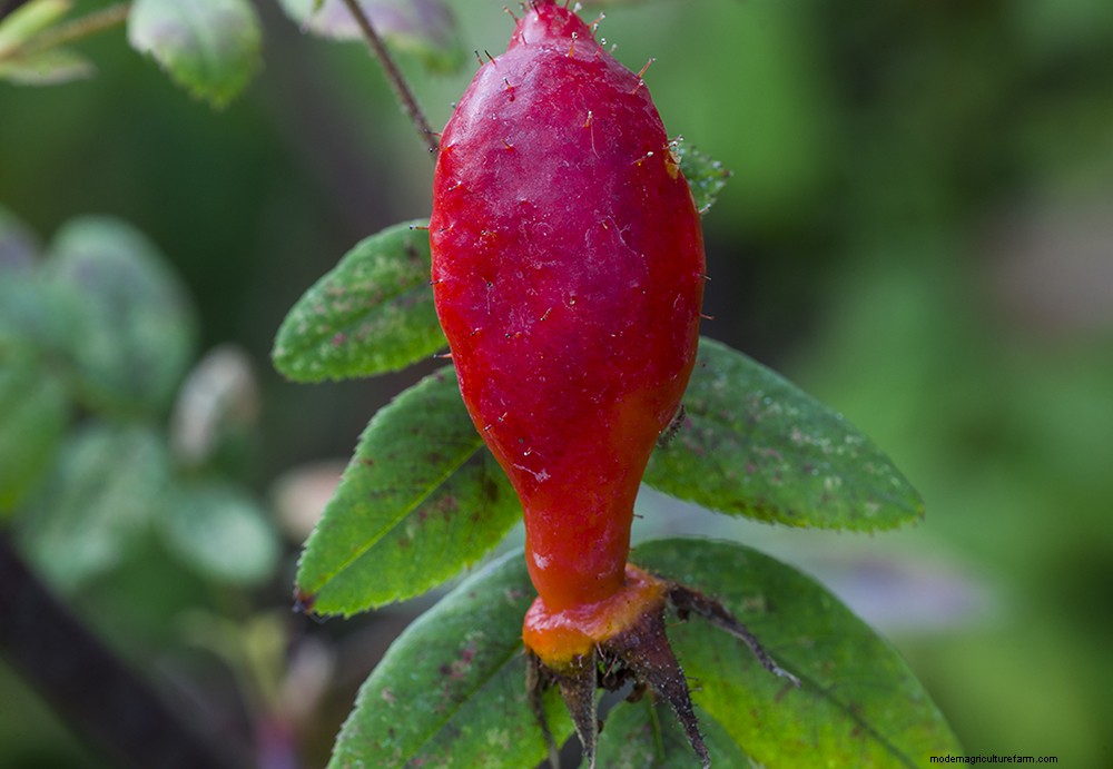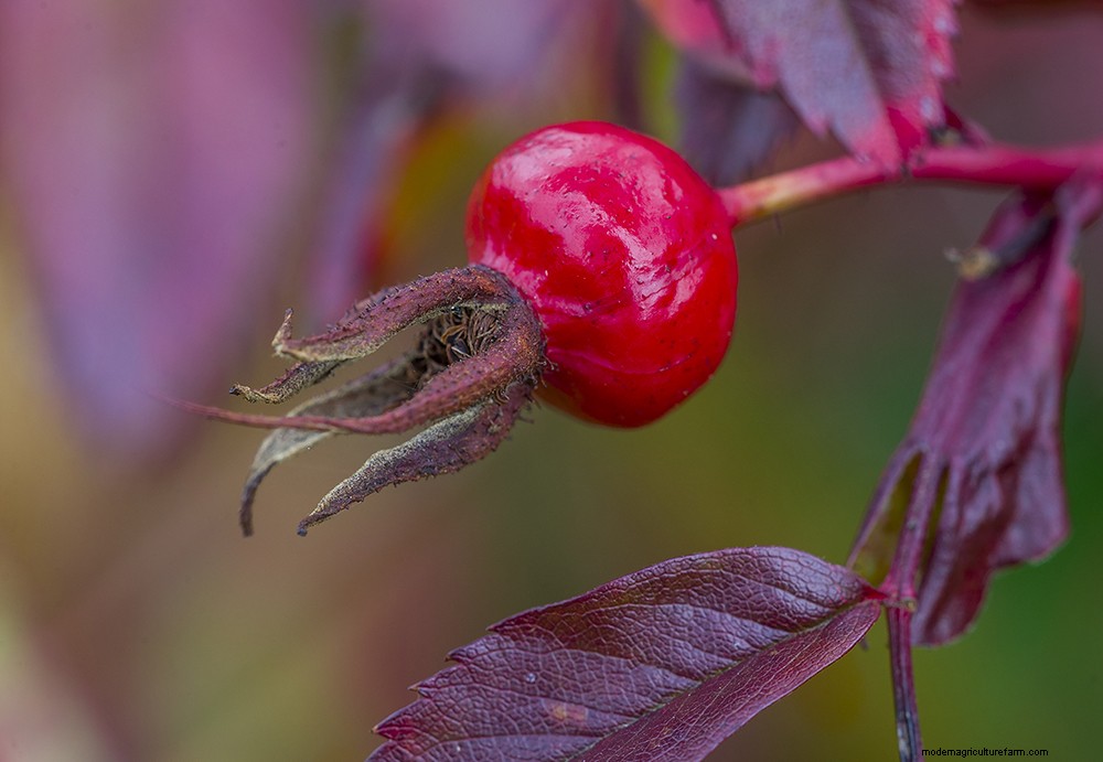 This is a rose that unveils appealing attributes throughout the growing season with the hips providing a striking finale. They finish the growing season in fine style, resembling chilli peppers in appearance, with plump fruits resplendent in rich ruby red. The flowers are splendid; single and deepest pink with long, prominent anthers. The stems have very few thorns and are a rich, attractive red, becoming purple with age.
