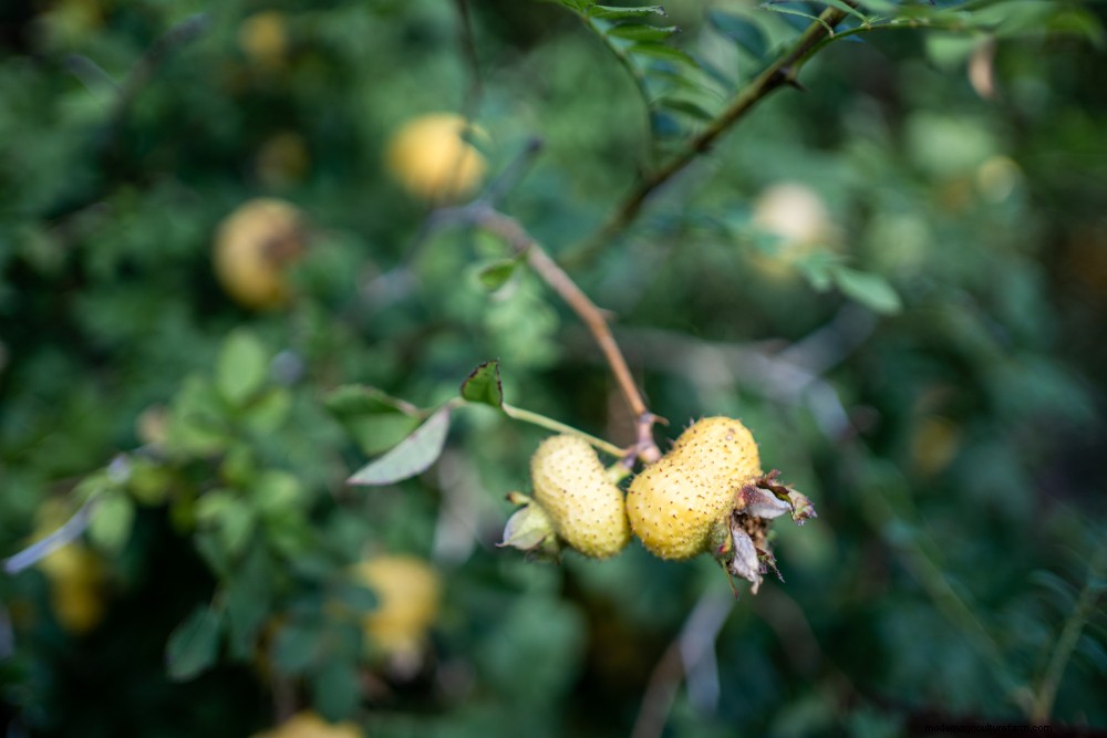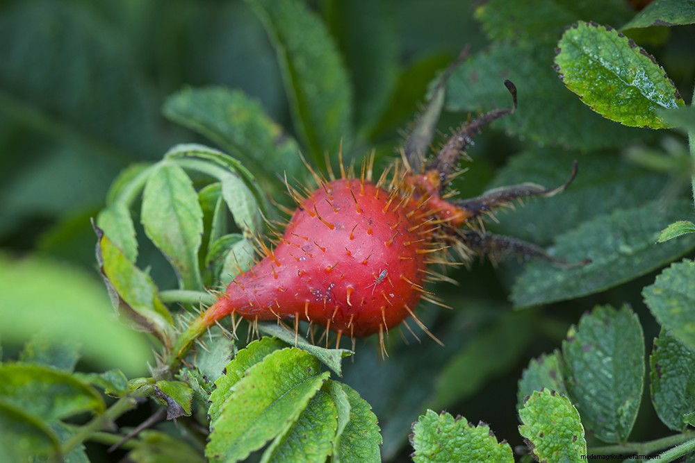A spiny rose in stem, bud and hip, forming an almost impenetrable shrub once it has grown to its full height of a metre and a half. The bristles around the flowerbuds offer a hint of what is to come from the hips, which are coated with stiff bristles that make them fruits to admire rather than harvest. The sleek, white-petals of the flowers are reminiscent of a silken blouse, and the rich, mustard-yellow stamens are the finishing touch.