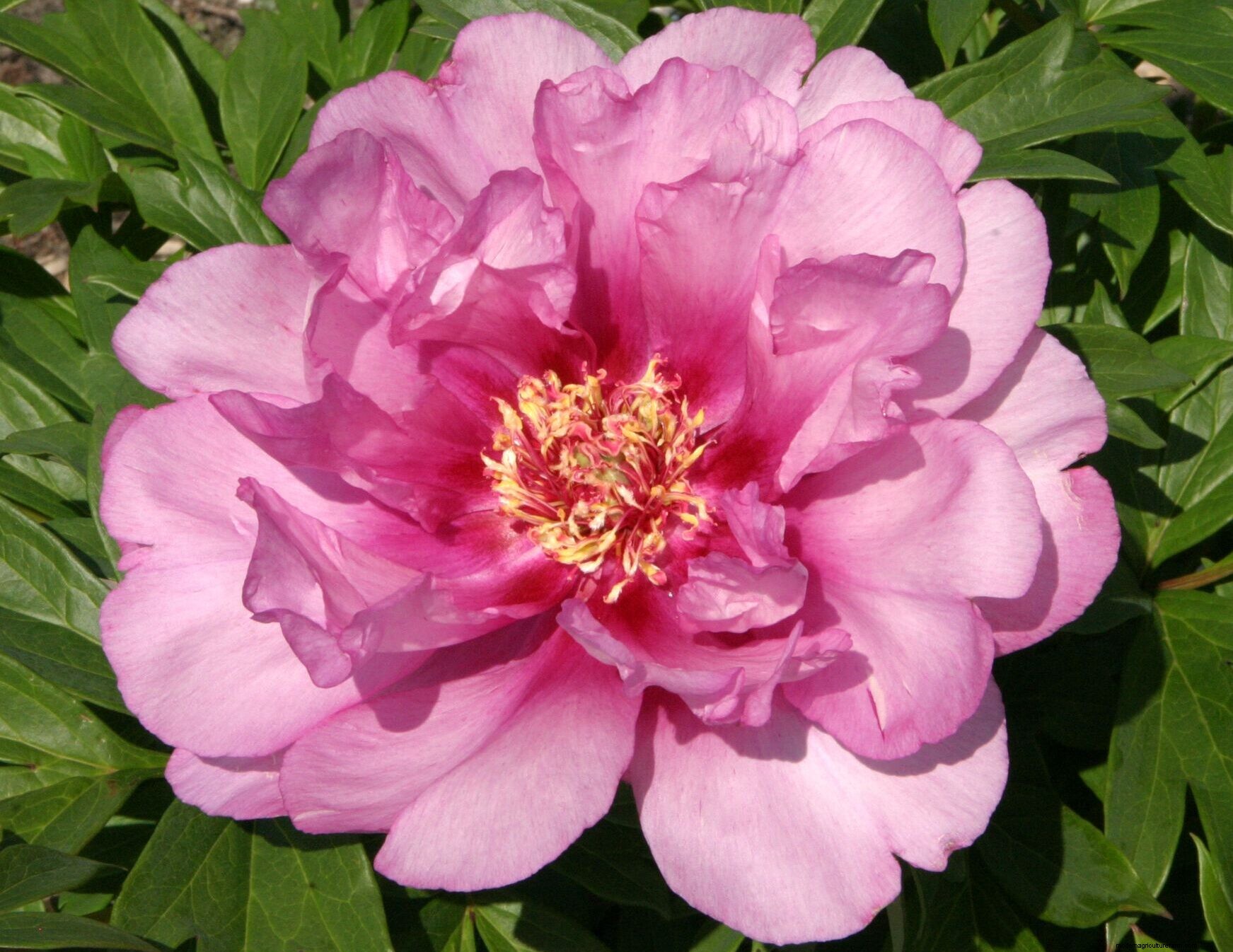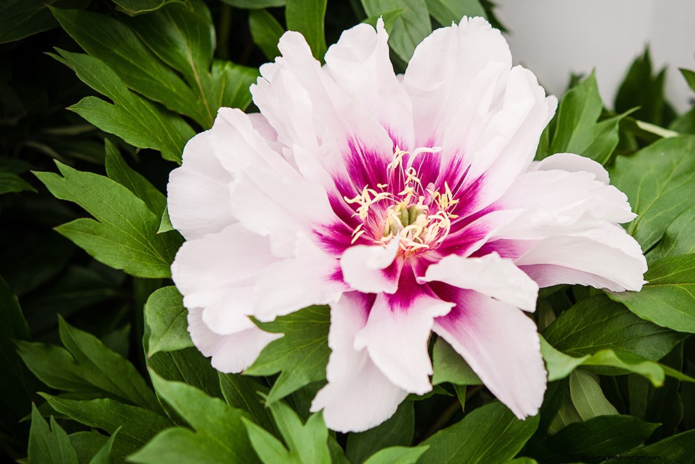 This peony boasts a lovely flower shape and good balance of foliage to flower. Neat habit.