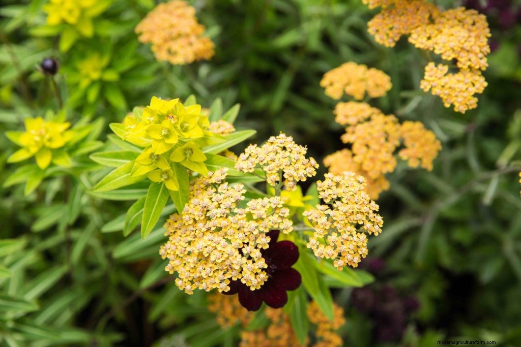 Achillea ‘Terracotta’ finds a perfect partner in Euphorbia polychroma. The orange flowerheads of the Achillea fade to a buttery yellow, perfectly complementing the yellowy-green bracts of the euphorbia. An understated colour combination but an unusual one. Throw in chocolate cosmos for further contrast.