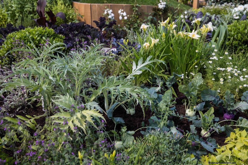 Vegetables can look great in a border because of the diversity of foliage colour and shape, as this exciting mix of kohl rabi, dwarf beans and artichokes proves.