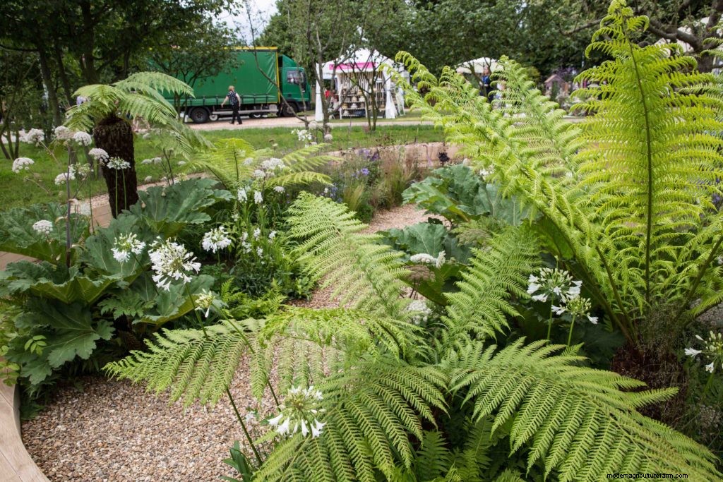 Towering tree ferns with large-leaved Gunnera is a classic combination and the addition of tall and airy white Agapanthus adds an exotic elegance.