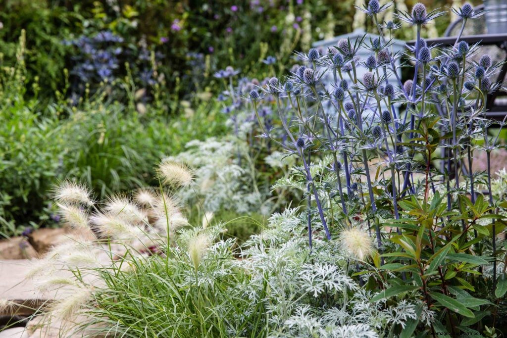 This ghostly blend of silver and blue shows how attractive different textures can look in a planting scheme. Finely cut foliage of silver Artemisia ‘Powis Castle’ mingles with the soft bottlebrush heads of Pennisetum. Towering Eryngium ‘Neptune’s Gold’ provides some eye-catching true blue.