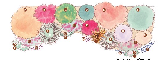 H 1 x Callicarpa bodinieri var. giraldii ‘Profusion’. Ht/Sp 2m x 1.5m (6ft 6in x 5ft), leaves turning amethyst.