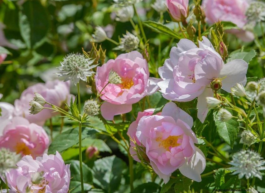 ‘The Mayflower’ is a pretty, vintage-looking, pink, double rose imbued with an old rose scent, and is seldom without flower. A great low-growing rose for ground cover is ‘Centre Stage’, which spreads and is smothered in pretty pink single roses. It starts in June and continues through to November.