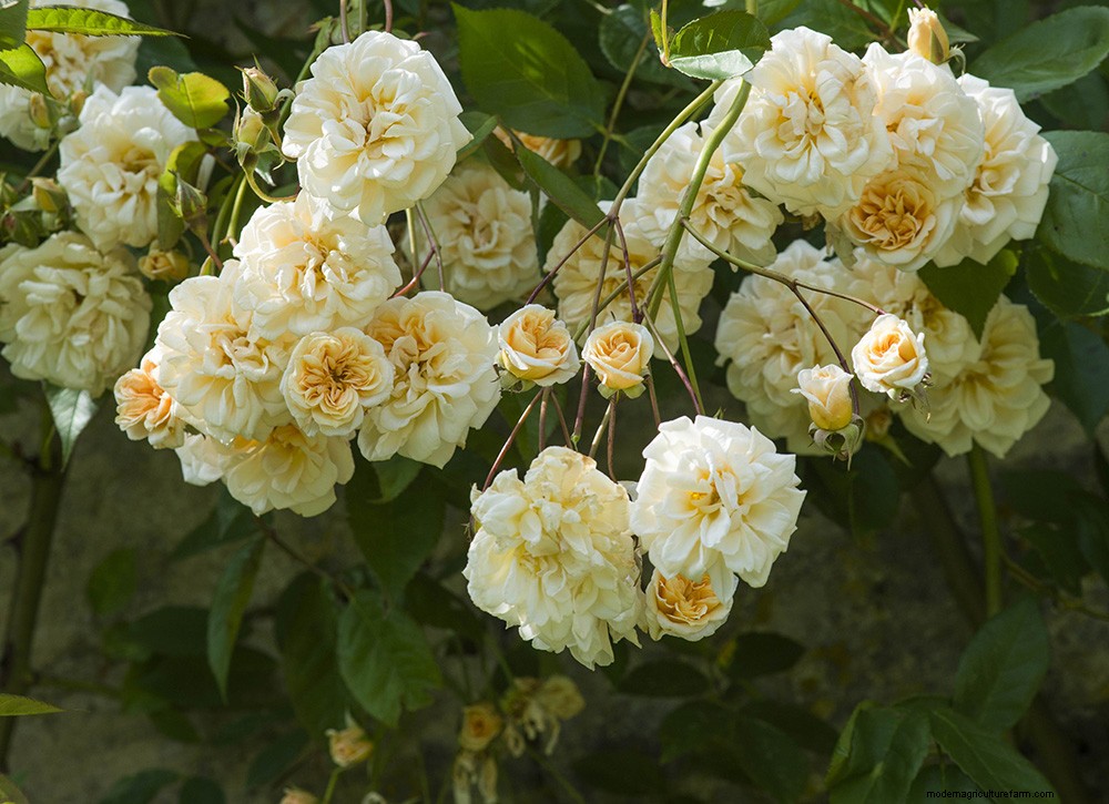 One of the few old climbing repeat roses is ‘Alister Stella Gray’, a stunning buttery-yellow rose with double rosettes, which appear first in small groups followed by large repeat sprays. Well-known ‘Madame Alfred Carrière’ is one of the best classic white climbing roses, with large tea-rose-scented blooms. And ‘Climbing Iceberg’ is a honey scented pure-white climber.